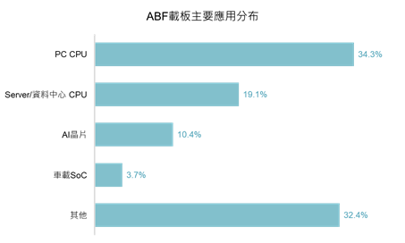 ABF載板方面,個人電腦用CPU為主要應用,約占34.3%的ABF載板產值,第二大應用為伺服器與資料中心用CPU,約占19.1%;隨著AI伺服器市場快速擴張,AI晶片需求持續上升,現已為第三大應用類別,約占10.4%。