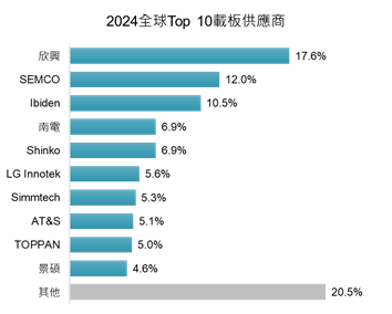 在整體載板市占分布方面,若以企業總部(HQ)所在地為統計基準,台灣為全球最大載板供應業者,市占率達33.5%,韓國(28.4%)與日本(27.3%)分居第二與第三,中國大陸雖然是全球最大的PCB供應業者,但在載板發展相對不足,市占率僅約5.7%。進一步觀察個別公司市占情形,台廠欣興以17.6%市占率居全球第一,其次為韓廠SEMCO(12.0%)、日廠Ibiden(10.5%)、台廠南電(6.9%)、日廠Shinko(6.9%)等。