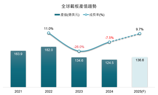 整體而言,2025年全球載板產業將重回成長軌道,預估年增幅為9.7%,市場規模達136.6億美元。惟成長幅度仍可能受到宏觀環境波動影響,後續仍需持續關注政策演變與終端市場需求動態