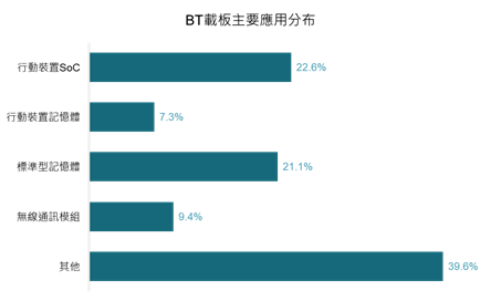 從應用分布來看,BT載板主要應用於行動裝置,包括系統單晶片(SoC)以及記憶體(如LPDDR、eMMC等),合計占BT載板產值約29.9%,為最大應用類別。其次為標準型記憶體,約占21.1%,涵蓋了DIMM與NAND Flash等,應用於電腦、伺服器等領域;另外還有無線通訊模組,約占9.4%。