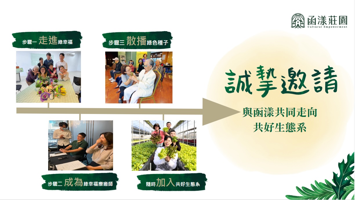 夥伴關係:函漾莊園期許成為與社會、環境共好之社會企業。藉由打造樂齡與友善的溫室場域並設計一系列園藝治療栽種活動,為樂齡與弱勢朋友創造一個樂齡與友善的溫室場域,增加社會參與創造生命尊嚴與價值.同時,號招具ESG願景企業與個體成為支持者,組建一個ESG人際網絡,提供金援與聲援,創建善之循環生態系,讓友善與樂齡永續溫室遍地開花。