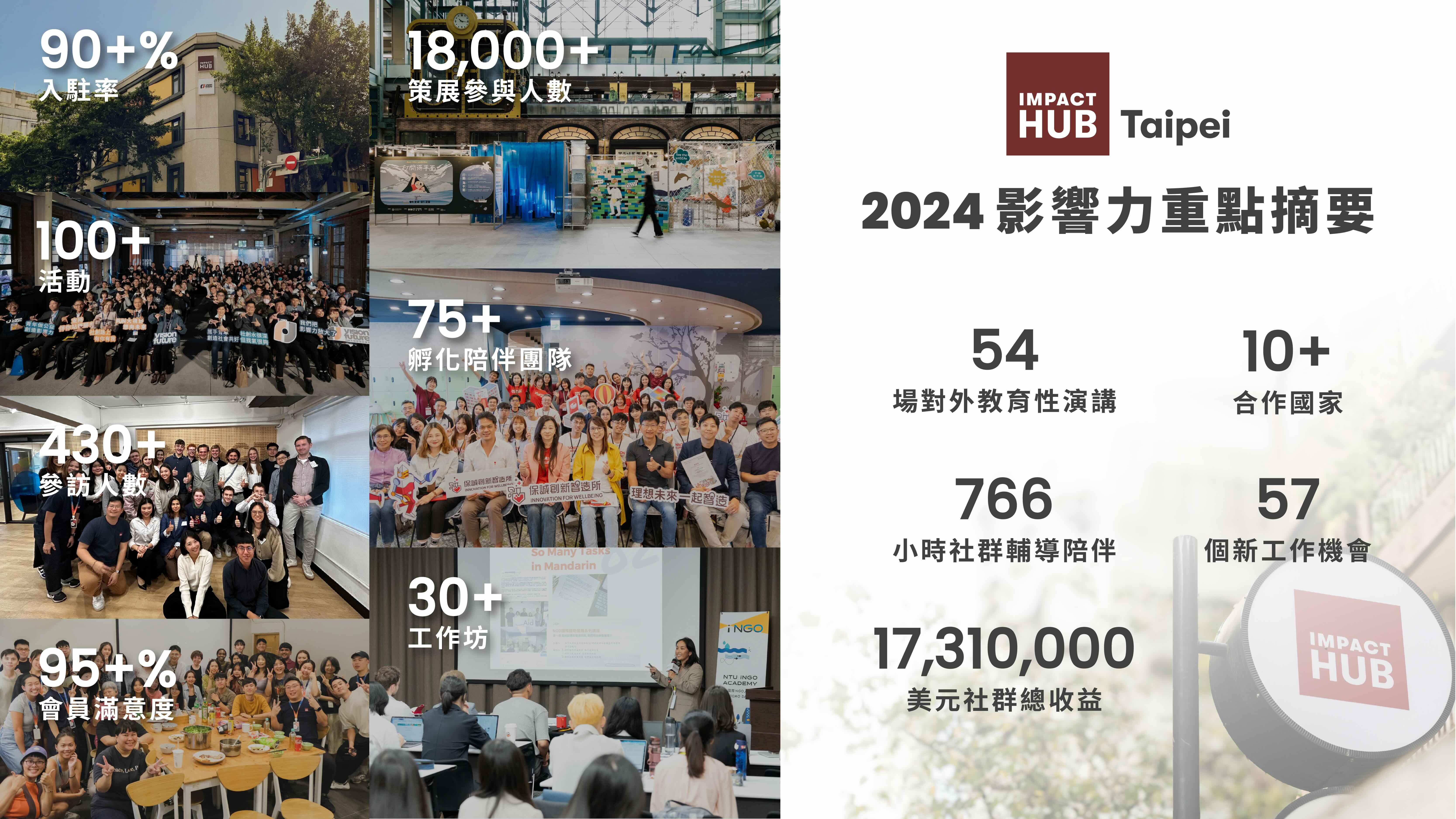 Impact Hub Taipei 成立於 2015 年,隸屬全球最大社會創新與社會企業網絡 Impact Hub Network,據點遍布全球主要城市。作為專業的創業支持組織(Entrepreneur Support Organization, ESO),持續協助並培育社會企業、非營利組織以及影響力創業團隊。