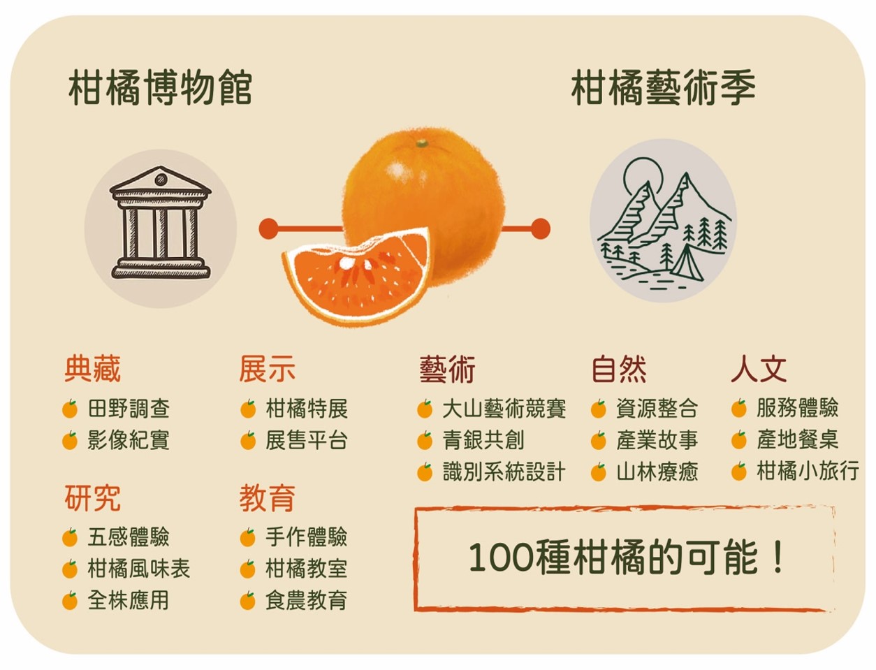 3. 展示:策劃一場大山背獨有的柑橘藝術季特展。透過裝置藝術與文化知識也藉此行銷大山背,提供在地小農產品實體平台曝光,讓大山背的柑橘文化傳遞給全台各地的遊客了解。