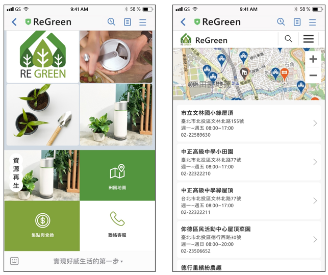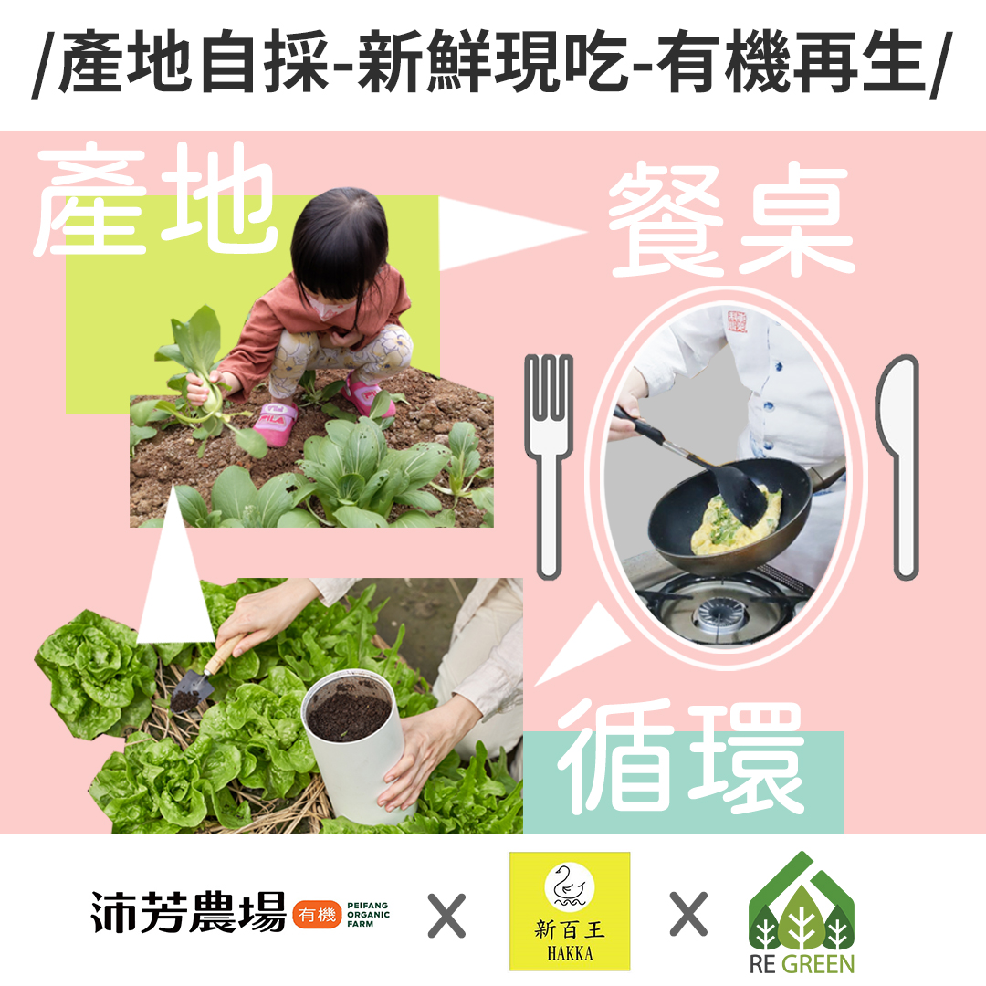 「 RE Green 居家製肥與食材交換平台」 可將消費者鏈結周邊有機田園點 ,將有機肥料之益菌再回到健康土壤 ,產生之有機蔬果可以回饋給消費者,形成一個良善循環並 推廣食物零廢棄及綠色生活, 藉由平台除了讓民眾贈送有機肥給田園點外,也幫助民眾可直接到產地購買蔬果,和做農村體驗,增加食農教育。