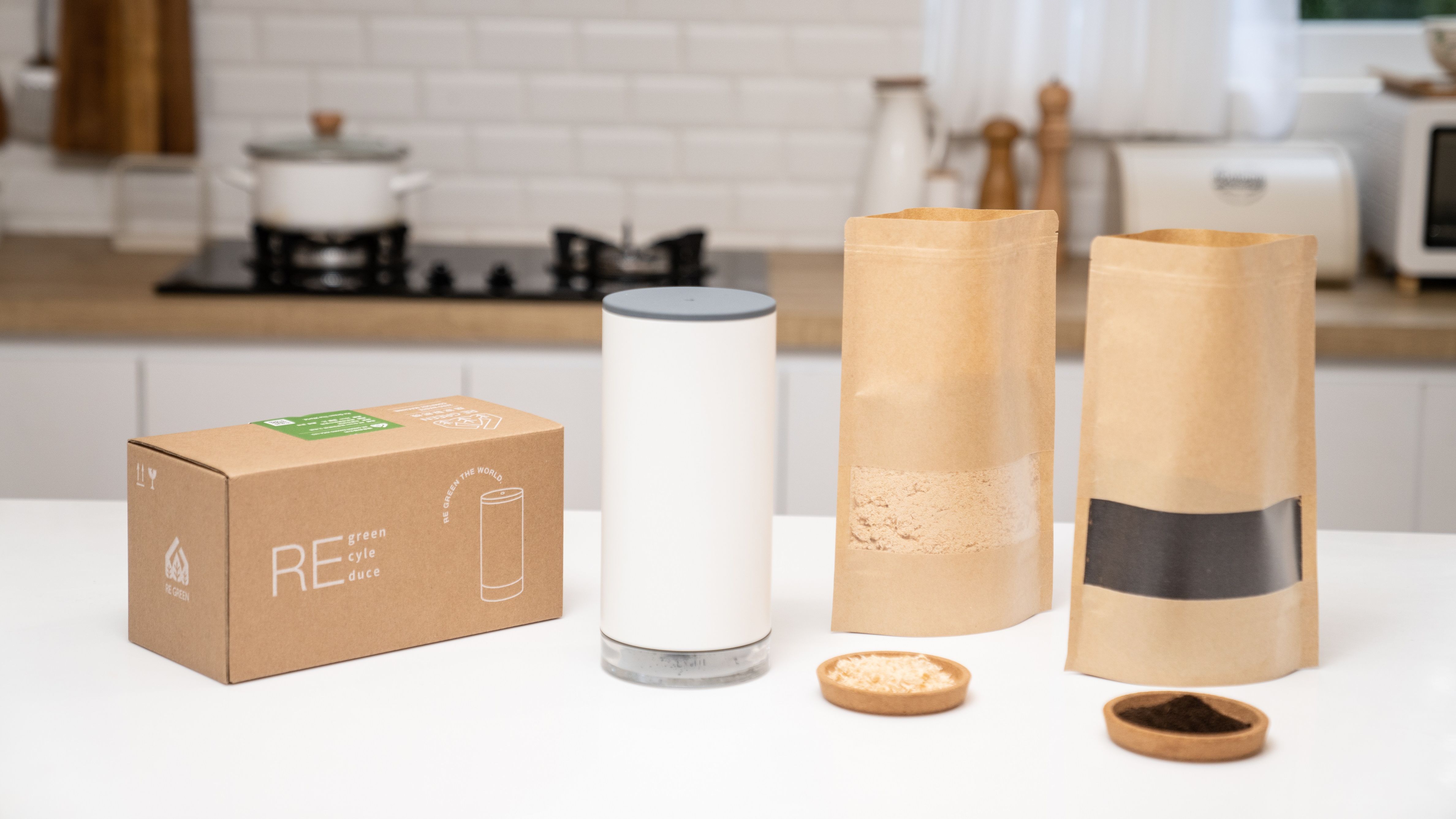 經過團隊專業研究開發,RE Green 入門款產品,可輕鬆在家使用,既實用又美觀,且無臭防蟲設計的「RE Green 居家製肥機」/「RE Green 防災製肥組」+「抑臭酵素」,讓居家剩食變肥料,達到食物零廢棄。