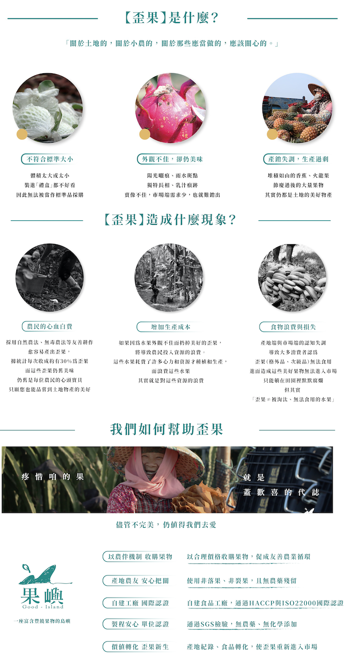 一次因緣際會下,我們在鄉下看見大量散落一地的水果,詢問農夫後才知曉,這些水果撇除腐爛的不談,大部分僅因賣像不符合市場規格與標準,不被中盤商所收購,只能留在原地無法進入市場,對於如此心疼的景象,我們不斷詢問自身能如何幫這些「歪果」賦予新價值,有重新進入市場的機會,並達到「農業價值再造」的目的。因此我們成立了「果嶼 good island」品牌。
