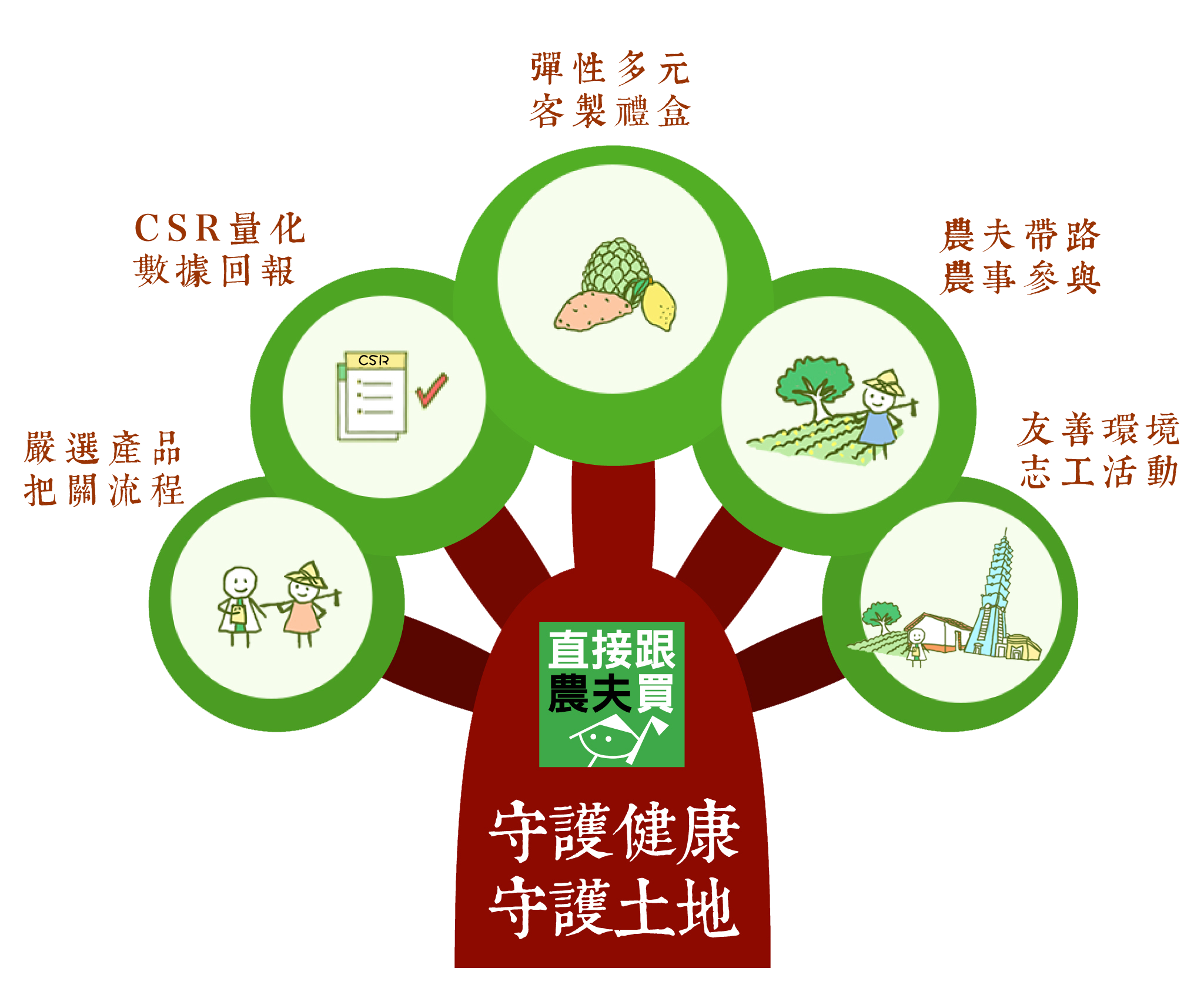 <直接跟農夫買>透過電子商務平台、與企業合作ESG專案、綠色採購,支持台灣友善環境生產者、以及陪伴有意願的農夫轉型更友善、更安全的方式生產。